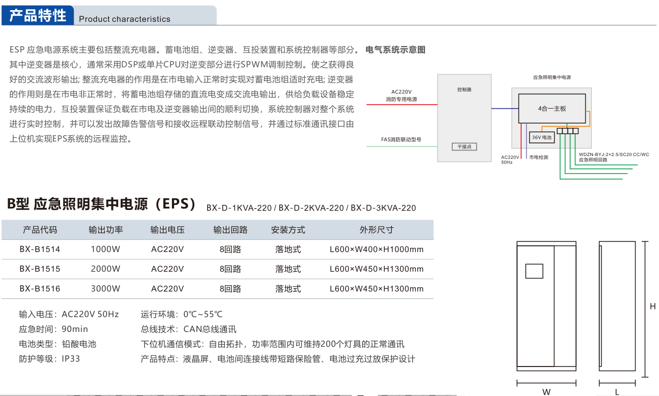 ESP 应急电源系统主要包括整流充电器。蓄电池组、逆变器、互投装置和系统控制器等部分。电气系统示意图其中逆变器是核心,通常采用DSP或单片CPU对逆变部分进行SPWM调制控制。使之获得良好的交流波形输出; 整流充电器的作用是在市电输入正常时实现对蓄电池组适时充电; 逆变器的作用则是在市电非正常时,将蓄电池组存储的直流电变成交流电输出,供给负载设备稳定持续的电力,互投装置保证负载在市电及逆变器输出间的顺利切换,系统控制器对整个系统进行实时控制,并可以发出故障告警信号和接收远程联动控制信号,并通过标准通讯接口由上位机实现EPS系统的远程监控。